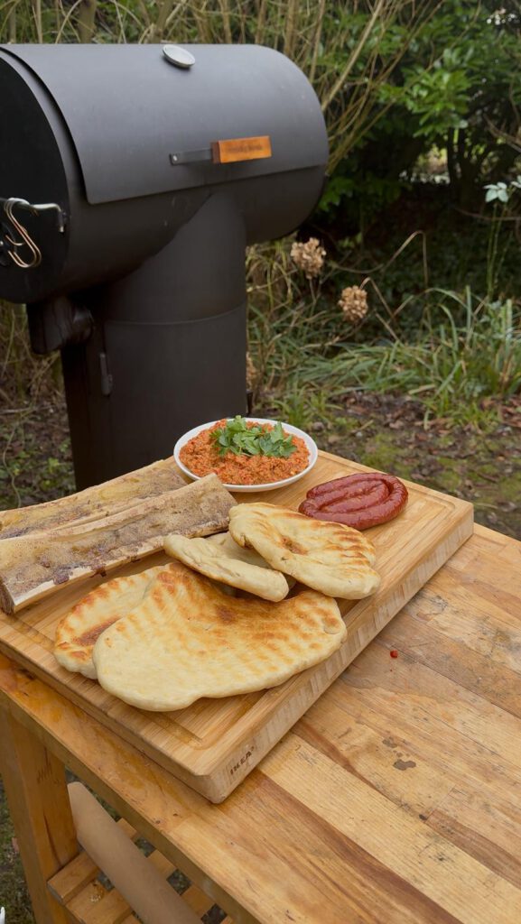Gegrilde kip met chimichurri en een salade met rode biet, rucola en kaas, geserveerd op een houten tafel met The Barrel barbecue op de achtergrond.