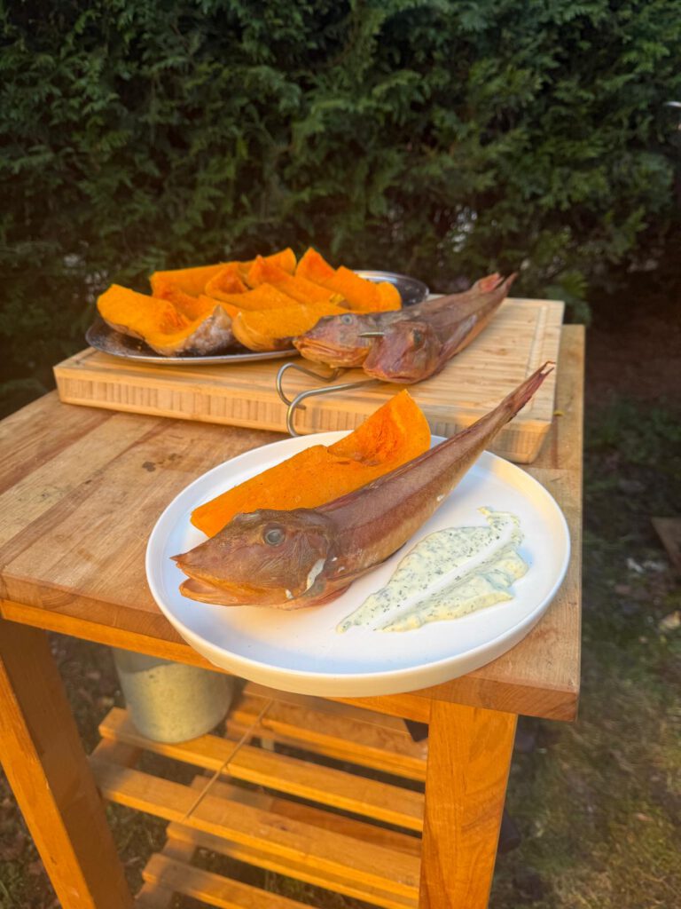 Een bord met gegrilde sardines, geserveerd met gegrilde paprika’s, een frisse saus en takjes peterselie ter garnering